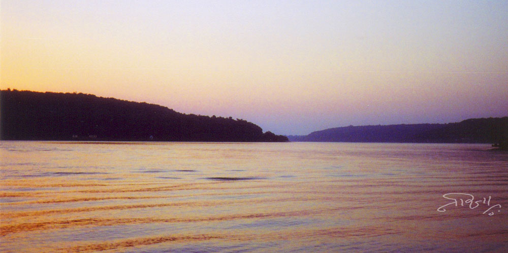 होता. उजव्या बाजूला पाण्याच्यापलिकडे डोंगराची धूसर किनार दिसत होती.